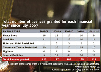 In 2007, when small-bar licences were added in WA, 125 licences were granted in total, compared to 177 in 2008-09, 189 in 2009-10, 165 in 2010-11 and 127 in the current financial year.