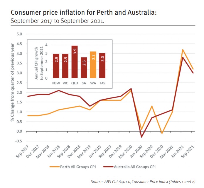 Perth’s consumer prices are expected to grow by 2.5 per cent in 2021-22 according to the WA government’s mid-year financial projections released in December.