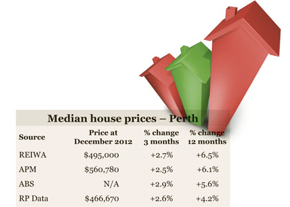 ABS and REIWA quoted the highest percentages of growth in median house prices, with a spike of 2.9 per cent over the past three months and 6.5 per cent for the year to December 2012 respectively.