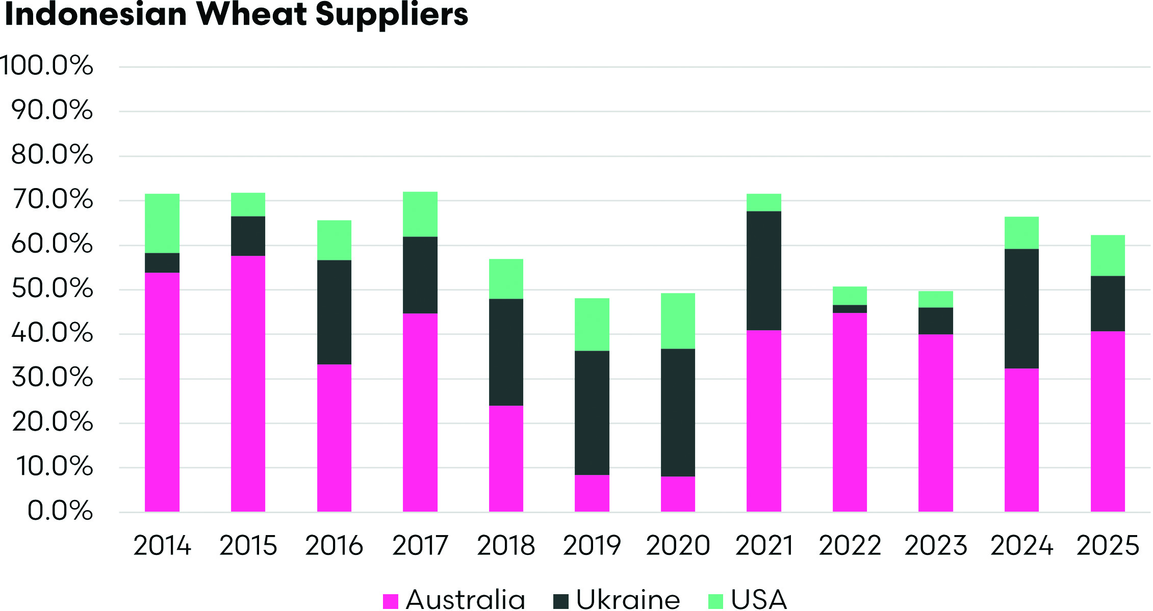 Indonesia is also a highly price-sensitive buyer. When Australian supply tightens or prices rise, other exporters step in quickly. Ukraine emerged as a major supplier after 2016 and shipped nearly 3mt to Indonesia in both 2019 and 2021. Canada is another consistent supplier, typically exporting between 1.3mt and 2.4mt each year.
