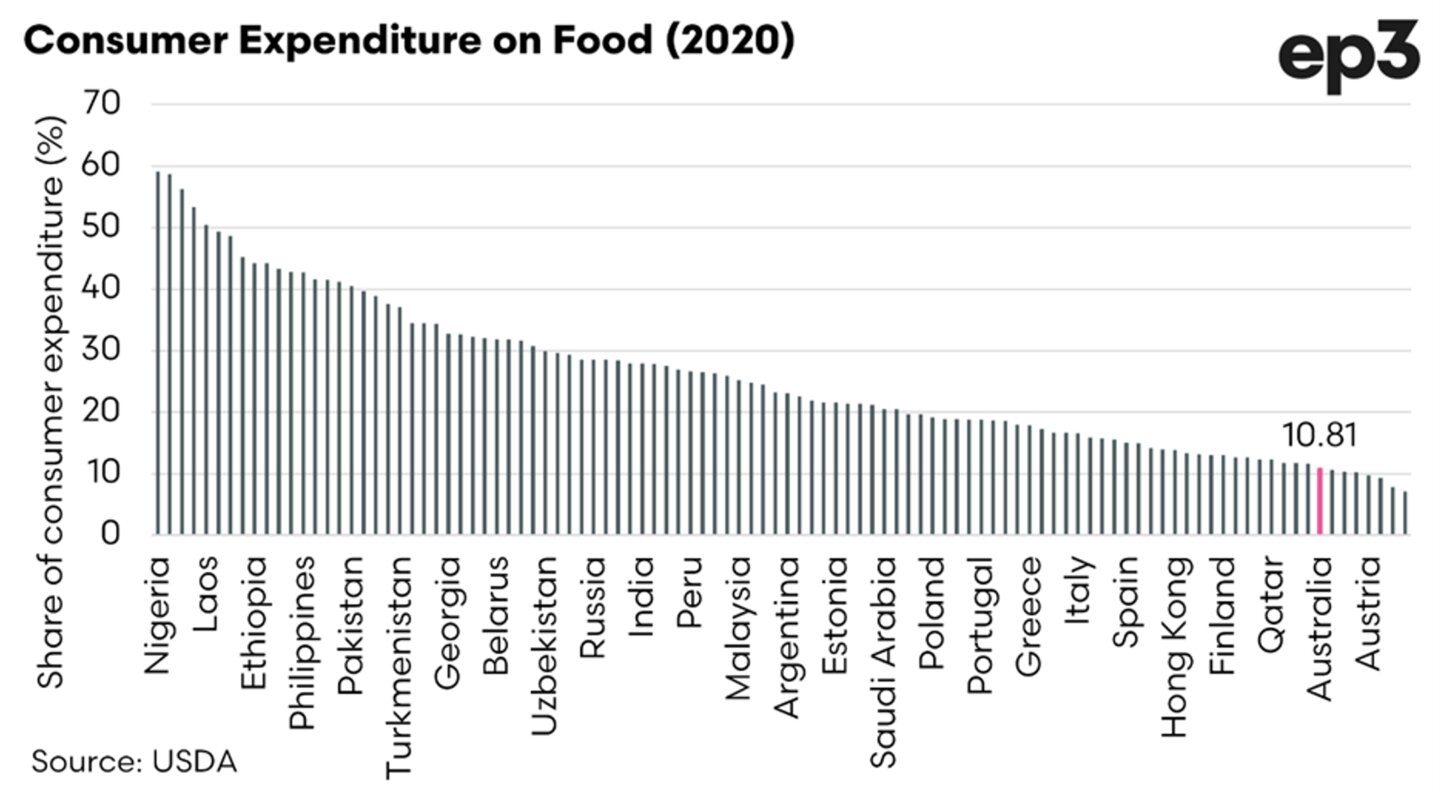 As Australian consumers spend a relatively low proportion of overall wages on food, there is a much larger degree of flexibility to divert spending from other goods to food in the event of higher food pricing.
