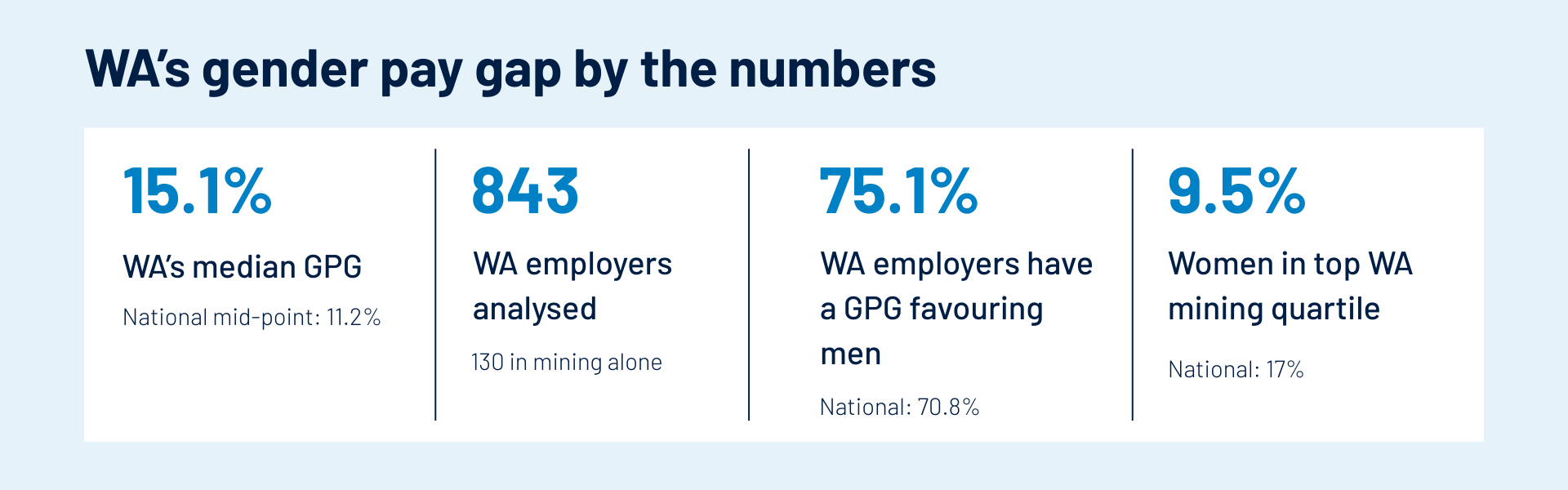 The WA mining median pay gap of 20.1 per cent exceeds the national mining mid-point of 18.9 per cent, and 85.4 per cent of WA mining employers sit above the 11.2 per cent national pay gap benchmark, compared with 81 per cent of mining employers nationally.